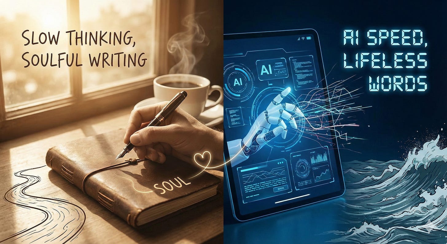 I feel my writing journey is the same. It was turbulent before (writing with AI) and now it is back into the flow state. In fact it was slow before I started using AI and I really miss those days of deep writing flow states. I am having fun writing this article without AI. When I write I am in a state of flow and writing is therapy. Writing is not about communicating your thoughts to other people. Writing is about thinking. Writing is a process of thinking slow.