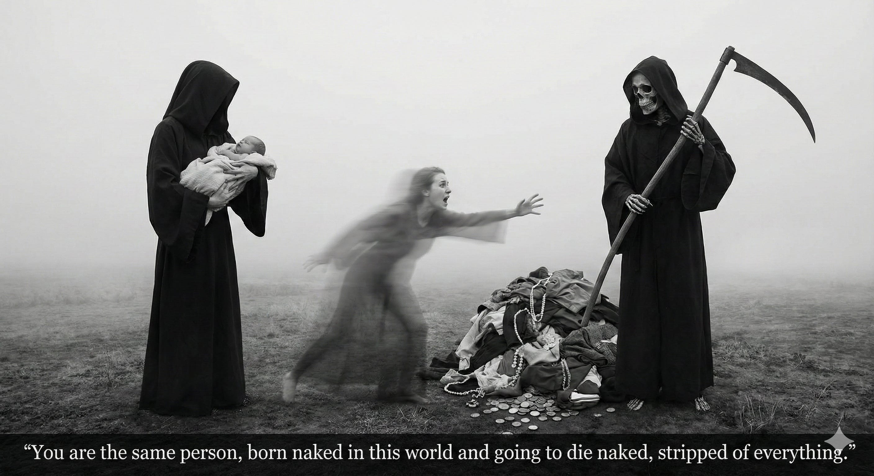 Born naked in this world and going to die naked, stripped of everything. The very desire to gain more things, is a way to fight with the grim reaper. It’s the desire for immortality and a fear of death. Remember, no one wins a fight with the grim reaper.