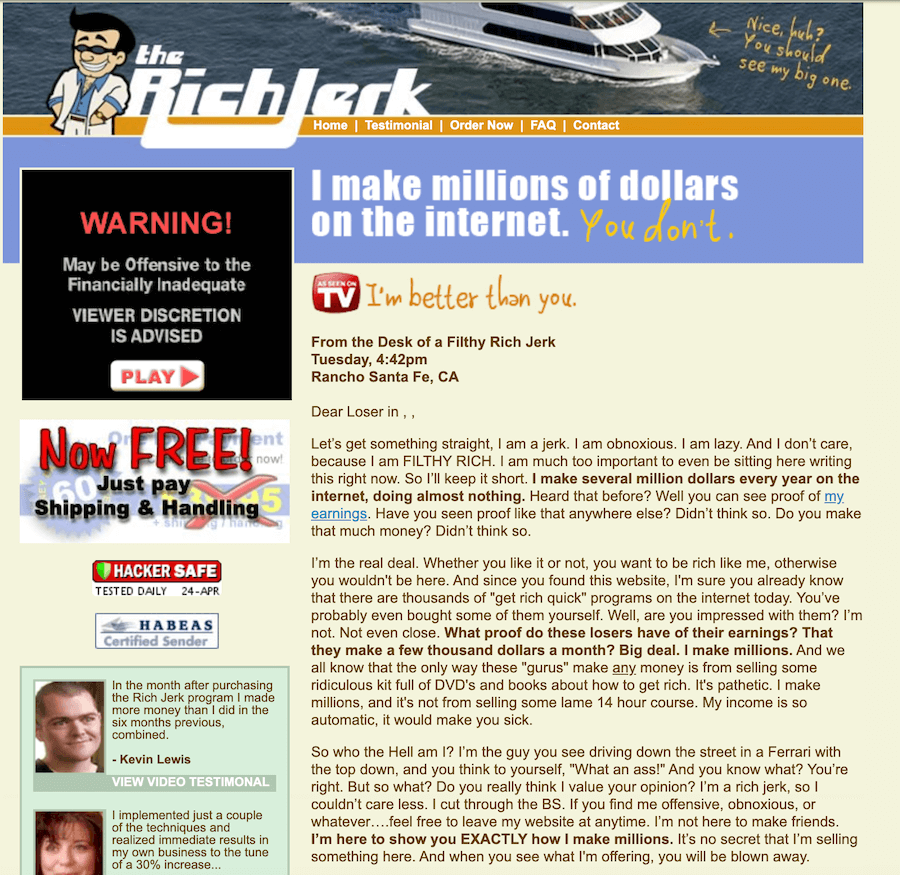 Let’s get something straight, I am a jerk. I am obnoxious. I am lazy. And I don’t care, because I am FILTHY RICH. I am much too important to even be sitting here writing this right now. So I’ll keep it short. I make several million dollars every year on the internet, doing almost nothing. Heard that before? Well you can see proof of my earnings. Have you seen proof like that anywhere else? Didn’t think so. Do you make that much money? Didn’t think so.