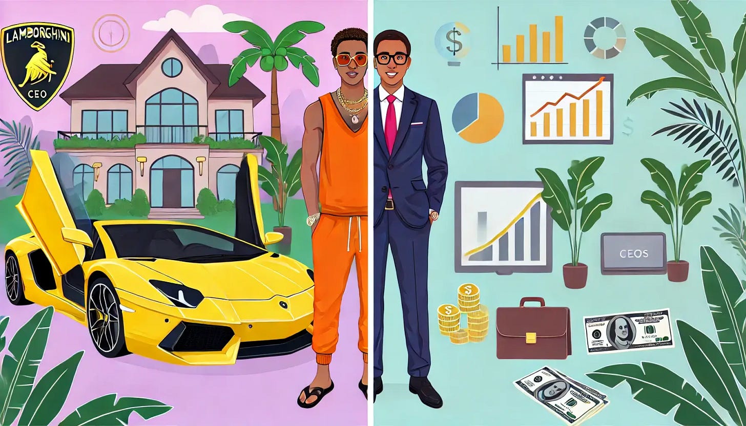 Driving a sports car and showing off on social media (hey, if I can buy this super costly car, then I should be successful, so you should listen to my advice so that you can also become successful.)